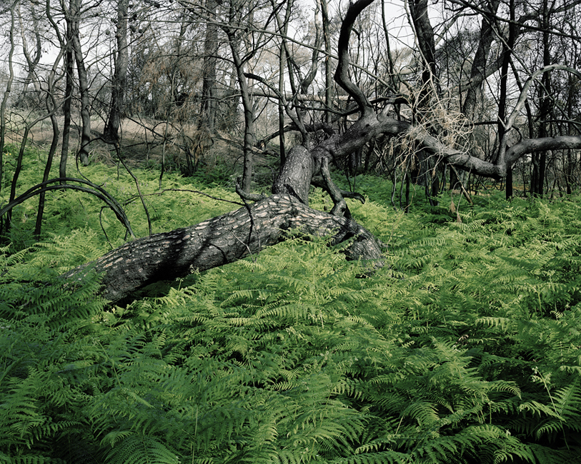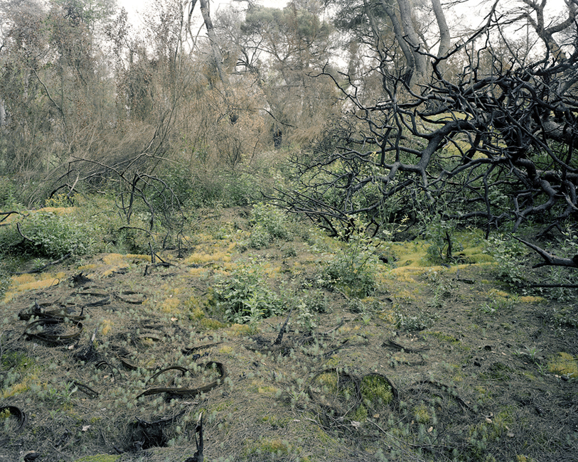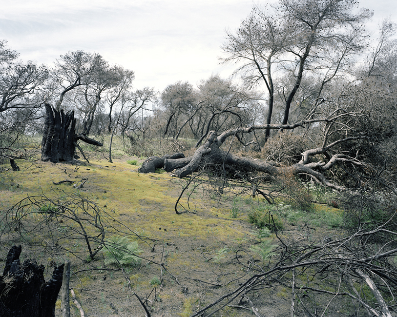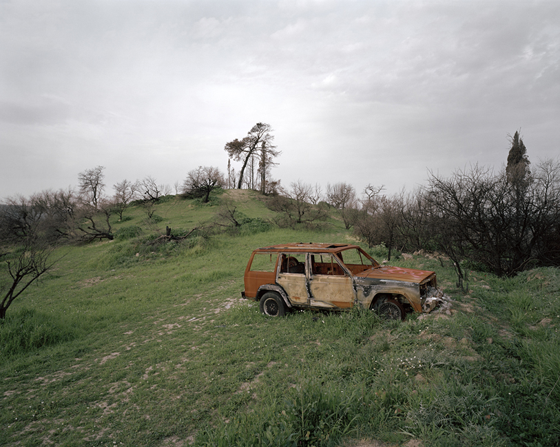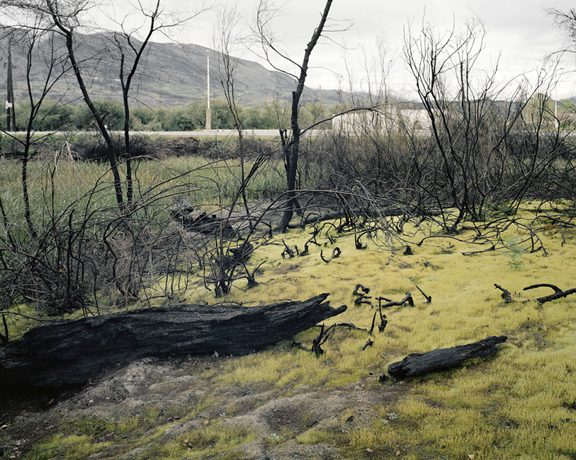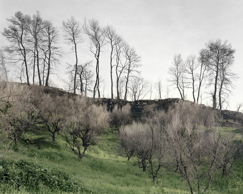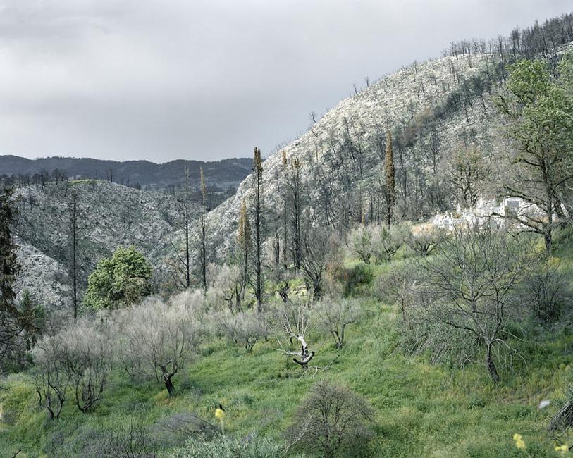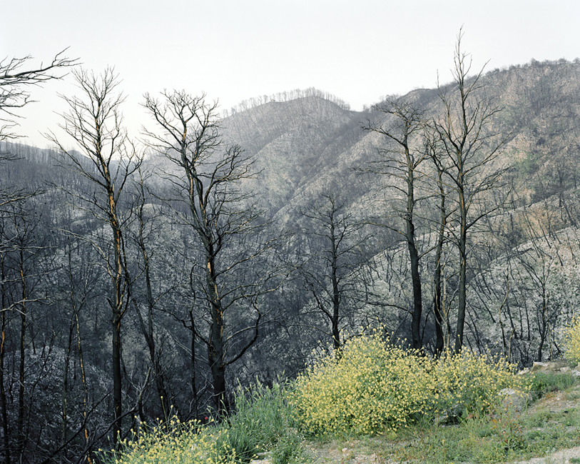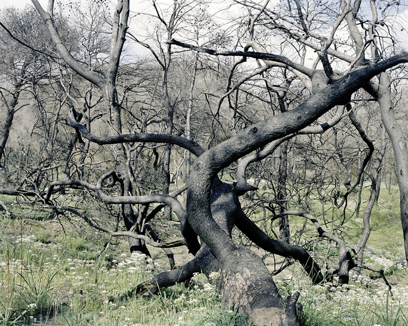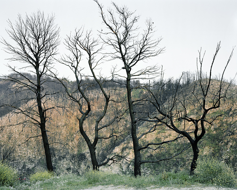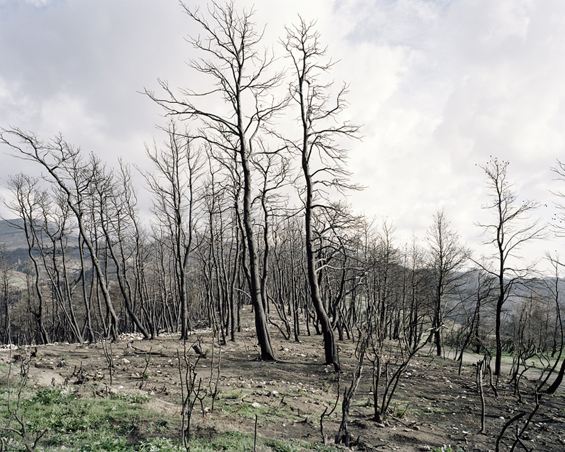 The photographs were produced as part of Gerull’s diploma thesis in 2008, following one of the severe fire periods that regularly affect Greece during the summer months. Rather than focusing on flames or human drama, Gerull’s images emphasize silence, scale, and destruction, revealing how fire reshapes entire ecosystems. By treating the burned terrain as a landscape rather than a news event, Greece on Fire stands as both a documentary record and an artistic reflection on climate vulnerability, land use, and the recurring cycle of Mediterranean wildfires